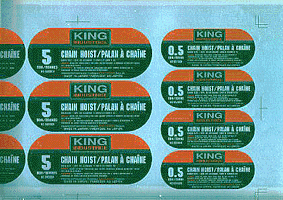 左図は、オフセット印刷機で消銀テトロンという材質に印刷し、ラミネート加工をしたものです。シールの型に抜く前の状態です。 画像では、実寸よりも縮小されています。 実際は縦に4つ並んでいる方の長さが、245mmです。 |